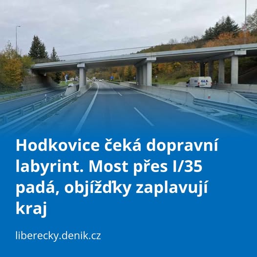 - Hodkovice bourání mostuŘeditelství silnic a dálnic (ŘSD) nám potvrdilo termín zahájení rekonstrukce mostu nad silnicí I/35. Celá akce začne 7. dubna 2026. Bourání mostu proběhne ze soboty 11. 4. 2026 na neděli 12. 4. 2026. V době bourání bude silnice I/35 zcela uzavřena a doprava bude vedena po objízdných trasách. https://liberecky.denik.cz/zpravy_region/doprava-most-hodkovice-objizdka-liberec.html?fbclid=IwY2xjawQ8SW1leHRuA2FlbQIxMABicmlkETF0OGcyTUVFNjF6eDRYaTVqc3J0YwZhcHBfaWQQMjIyMDM5MTc4ODIwMDg5MgABHoiJ09KDqWm_jyY0fJIf1hnLDzxaKAbSug25LxrEfDr78rrs_cWoquuixOk7_aem_Xja-iz9dAafSTJS6dUdHFQ
