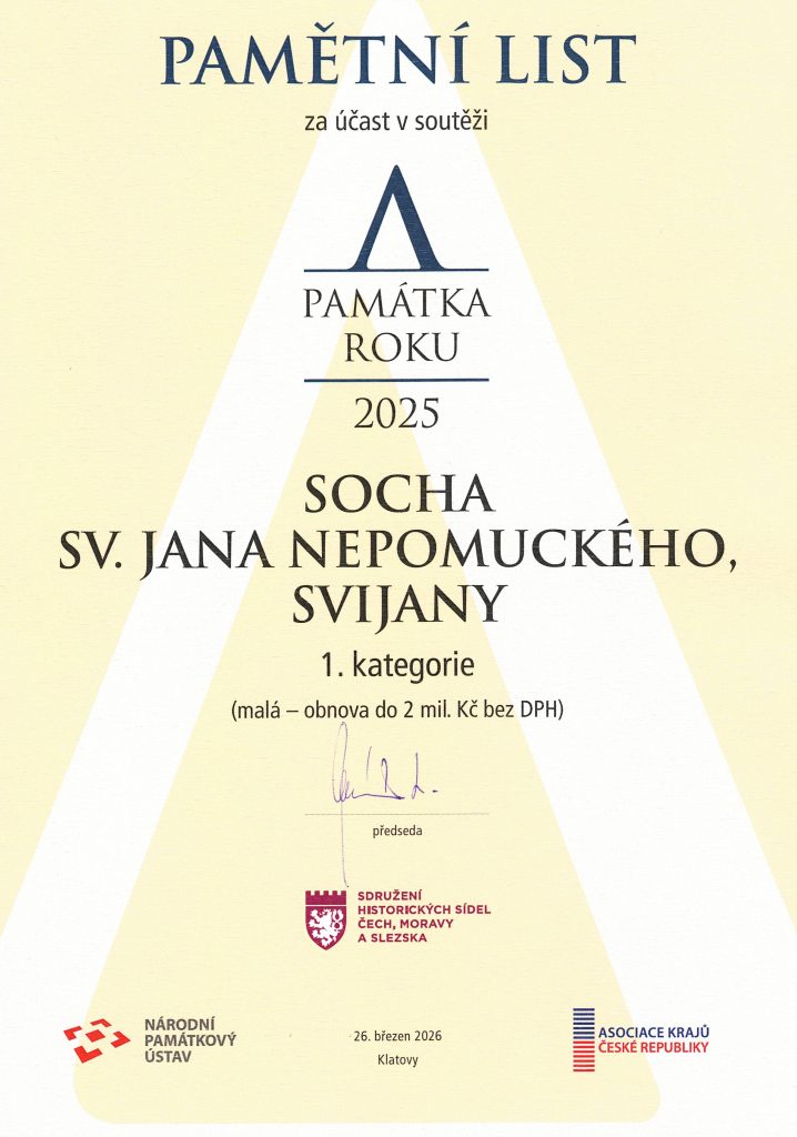 Socha sv. Jana Nepomuckého – Pamětní list Domov / Aktuality / Renovace sochy sv. Jana Nepomuckého získala za účast v soutěži Památka roku 2026 pamětní list