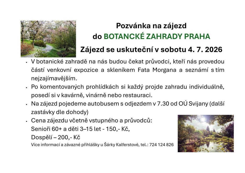 Botanická zahrada Praha – zájezd Domov / Kalendář akcí / Datum 4. 7. 2026 Čas 7:30 - 15:00 Obecní úřad Svijany 71